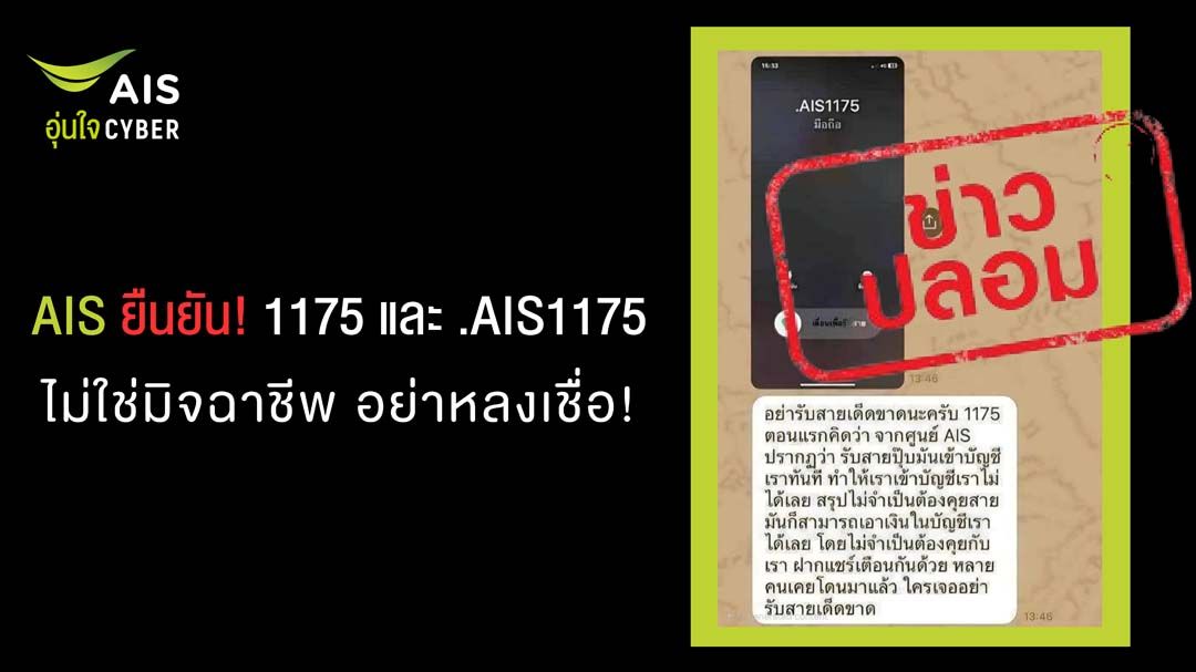 ทาง AIS ขอยืนยันว่า “1175” เป็นเบอร์โทรของศูนย์บริการคอนแทคเซ็นเตอร์ของบริษัทฯ ใช้สำหรับให้ข้อมูลและอำนวยความสะดวกด้านบริการของ AIS เท่านั้น เช่น การสอบถามบริการ การสมัครแพ็กเกจ และการติดต่อดูแลการใช้งาน ไม่สามารถเข้าถึงบัญชีหรือแอปพลิเคชันทางการเงินของลูกค้าได้จากการรับสาย
