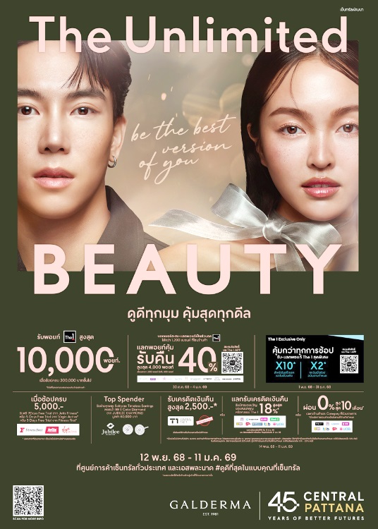 จัดแคมเปญ “THE UNLIMITED BEAUTY” ตั้งแต่วันนี้ถึง 11 มกราคม 2569 ที่ศูนย์การค้าเซ็นทรัล และเอสพละนาด ช้อปคุ้มกับสิทธิพิเศษจาก The 1 และพาร์ทเนอร์ ช้อปครบ 30,000 บาท รับคะแนน The 1 เพิ่ม 1,000 คะแนน จำกัด 1,300 สิทธิ ช้อปครบ 100,000 บาท รับคะแนน The 1 เพิ่ม 3,000 คะแนน จำกัด 600 สิทธิ ช้อปครบ 300,000 บาท รับคะแนน The 1 เพิ่ม 6,000 คะแนน จำกัด 250 สิทธิ ,ช้อปครบ 5,000 บาท รับสิทธิ์ทดลองเล่น Fitness ฟรี (เฉพาะสาขาที่ร่วมรายการ) 7 Days Free Trial ที่ Jetts Fitness หรือ Fitness First หรือ 5 Days Free Trial ที่ Virgin Active ,Top Spender ที่มียอดใช้จ่ายสูงสุดเป็นอันดับแรก รับต่างหูเพชร Solitaire Timeless Earrings น้ำหนัก รวม 99 E Color Diamond จาก JUBILEE DIAMOND มูลค่า 60,000 บาท ,The 1 Biz แลกคะแนนรับคืนสูงสุด 40% (สูงสุด 4,000 คะแนน) ,รับเครดิตเงินคืนรวมสูงสุด 18% สำหรับบัตรเครดิตที่ร่วมรายการ ,ผ่อน 0% สูงสุด 10 เดือน เฉพาะสินค้าที่ร่วมรายการ