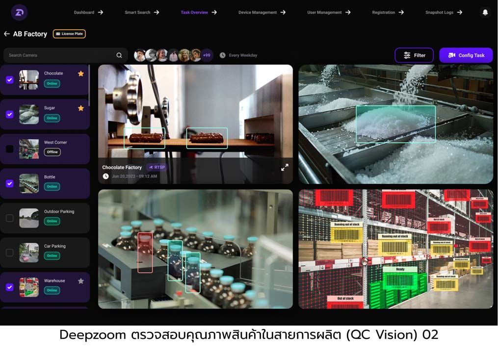 + การปรับแต่งโมเดลเฉพาะองค์กร (Customization): นอกเหนือจากชุดโมเดลมาตรฐานที่มีอยู่ Deepzoom ยังสามารถพัฒนาและปรับแต่งโมเดลให้ตรงกับโจทย์เฉพาะของแต่ละองค์กร เพื่อดึงศักยภาพของข้อมูลภาพมาใช้ประโยชน์สูงสุด ตัวอย่างเช่น ระบบตรวจสอบคุณภาพสินค้าในสายการผลิต (QC Vision) ที่สามรรถตรวจจับความผิดปกติของสินค้าได้แบบเรียลไทม์ ช่วยแก้ไขปัญหาตั้งแต่ต้นทาง ลดของเสีย ลดงานตรวจซ้ำ และเพิ่มประสิทธิภาพของสายการผลิตโดยรวมอย่างมีประสิทธิภาพ