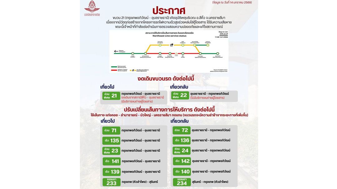 ทั้งนี้ การรถไฟฯ จึงมีความจำเป็นต้องงดเดินและปรับเปลี่ยนเส้นทางขบวนรถสายตะวันออกเฉียงเหนือ ที่มีต้นทางและปลายทางอุบลราชธานี ช่วงสถานีชุมทางแก่งคอย - ชุมทางบัวใหญ่ - นครราชสีมา ในวันนี้ (14 มกราคม 2569) จำนวน 14 ขบวน ดังนี้