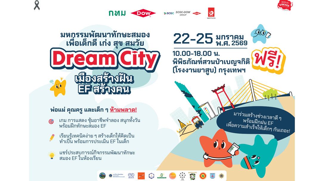 ข่าวดีสำหรับผู้ปกครอง คุณครู และน้องๆ ชาวกทม. กับควันหลงวันเด็กในปีนี้ ฟรี! ร่วมสนุกได้กว่า 40 ซุ้มกิจกรรมขนาดใหญ่ พร้อมเวทีการแสดงและแบ่งปันความรู้ด้านการพัฒนาทักษะสมอง EF หรือ Executive Function ในเด็ก ซึ่งเป็นสมองส่วนที่ควบคุมการคิดวิเคราะห์ การควบคุมอารมณ์ และการกำกับตนเอง พบกันวันที่ 22–25 มกราคม 2569 ณ พิพิธภัณฑ์สวนป่าเบญจกิติ (โรงงานยาสูบ) กรุงเทพมหานคร เวลา 10:00-18:00 น. กับมหกรรมพัฒนาทักษะสมองเพื่อเด็กดี เก่ง สุข สมวัย “ดรีมซิตี้: เมืองสร้างฝัน อีเอฟสร้างคน” ติดตามรายละเอียดได้ที่เฟซบุ๊ก Dow Thailand Group