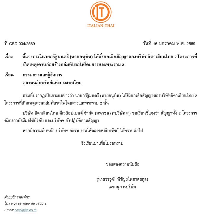 16 มกราคม 2569 บริษัท อิตาเลียนไทย ดีเวล็อปเมนต์ จำกัด (มหาชน) แจ้งตลาดหลักทรัพย์แห่งประเทศไทย ว่า ตามที่ปรากฏเป็นกระแสข่าวว่านายกรัฐมนตรี (นายอนุทิน ชาญวีรกูล) ได้สั่งยกเลิกสัญญาของบริษัท อิตาเลียนไทย 2 โครงการที่เกิดเหตุเครนถล่มทับรถไฟไฟโดยสารและพระราม 2 นั้น