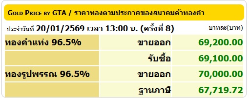 20 มกราคม 2569 สมาคมค้าทอง ประกาศราคาทองคำ 96.5% ในประเทศ ครั้งที่ 8 เมื่อเวลา 13.00 น. ดังนี้
