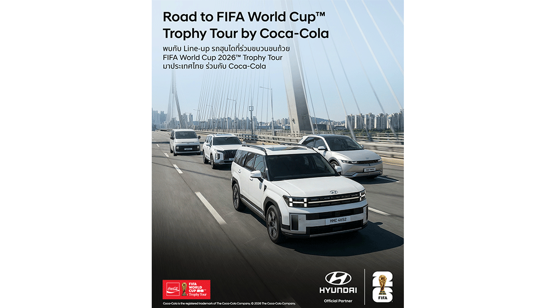 ฮุนได จับมือกับ “โคคา-โคล่า” จุดประกายความคลั่งไคล้ลูกหนังในประเทศไทย ผ่านกิจกรรมระดับโลก FIFA World Cup 2026™ Trophy Tour by Coca-Cola นำถ้วยแห่งประวัติศาสตร์อันทรงคุณค่าและยิ่งใหญ่ที่สุดในวงการฟุตบอลอย่าง FIFA World Cup™ Trophy ก่อนศึก FIFA World Cup 2026™ จะระเบิดความมันทั่วโลก โดยฮุนไดในฐานะ Mobility Partner จัดขบวนรถยนต์พิเศษทำหน้าที่ขนส่งถ้วยแชมป์สัญลักษณ์แห่งความฝัน ความสำเร็จ และเกียรติยศสูงสุดของนักฟุตบอลอาชีพ