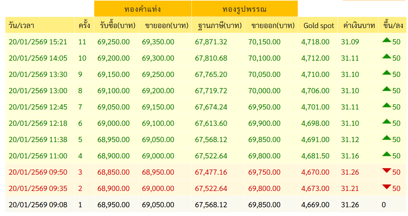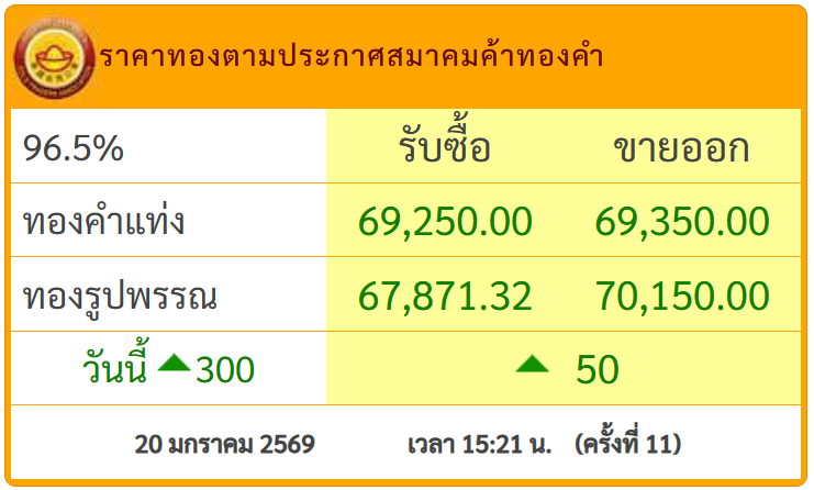 20 ม.ค.69 เมื่อเวลา 15.21 น. สมาคมค้าทองคำ รายงานราคาทองถูกปรับขึ้นเป็นประวัติศาสตร์ โดย ราคาทองคำแท่ง รับซื้อ 69,250.00 ขายออก 69,350.00 ส่วนทองรูปพรรณ รับซื้อ 67,871.32 ขายออก 70,150.00