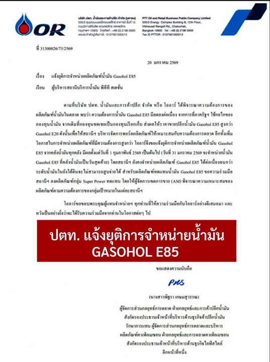22 มกราคม 2569 บริษัท ปตท. น้ำมันและการค้าปลีก จำกัด (มหาชน) (OR) มีหนังสือถึงผู้บริหารสถานีบริการน้ำมัน พีทีที สเตชั่น แจ้งยุติการจำหน่ายผลิตภัณฑ์น้ำมัน Gasohol E85