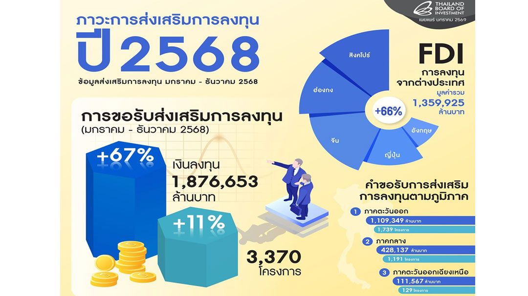 นายนฤตม์ เทอดสถีรศักดิ์ เลขาธิการคณะกรรมการส่งเสริมการลงทุน (บีโอไอ) เปิดเผยว่า คำขอรับการส่งเสริมการลงทุนในปี 2568 เพิ่มขึ้นอย่างมีนัยสำคัญ ทั้งจำนวนโครงการและเงินลงทุน โดยมีจำนวน 3,370 โครงการ เพิ่มขึ้น 11% และมีเงินลงทุน 1,876,653 ล้านบาท เพิ่มขึ้นถึง 67% นับเป็นยอดเงินลงทุนและจำนวนโครงการ ที่ยื่นขอรับการส่งเสริมที่สูงสุดนับตั้งแต่ก่อตั้งบีโอไอ สะท้อนถึงความเชื่อมั่นของนักลงทุนต่อศักยภาพและความพร้อมของประเทศไทยในการรองรับการลงทุน โดยเฉพาะอุตสาหกรรมใหม่ที่ใช้เทคโนโลยีขั้นสูงและอุตสาหกรรมสีเขียวที่จะนำไปสู่การพัฒนาที่ยั่งยืน โดยนักลงทุนมองว่าประเทศไทยมีปัจจัยพื้นฐานที่แข็งแกร่ง เหมาะสมกับการลงทุนระยะยาว และตอบโจทย์การลงทุนในโลกยุคใหม่ ไม่ว่าจะเป็นโครงสร้างพื้นฐานและระบบโลจิสติกส์ ศักยภาพด้านพลังงานสะอาด บุคลากรที่มีคุณภาพ ซัพพลายเชนที่ครบวงจร นโยบายส่งเสริมการลงทุนที่ชัดเจนและต่อเนื่อง การอำนวยความสะดวกด้านการลงทุน รวมทั้งจุดยืนของประเทศไทยในเวทีโลกที่พยายามรักษาความเป็นกลางและความสัมพันธ์ที่ดีกับนานาประเทศ ทำให้สามารถค้าขายกับตลาดต่าง ๆ ทั่วโลก