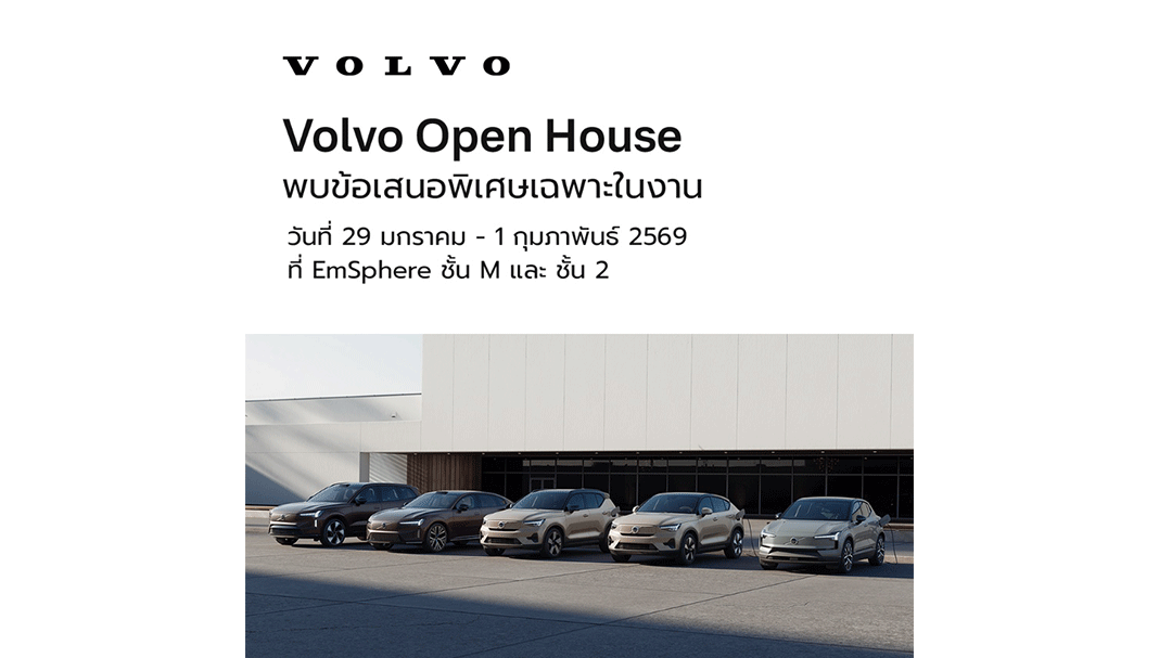 Volvo Open House เปิดโอกาสให้ผู้สนใจเป็นเจ้าของรถวอลโว่ พร้อมข้อเสนอสุดเอ็กซ์คลูซีฟ ไม่ว่าจะเป็นรถไฟฟ้าเต็มรูปแบบ หรือรถปลั๊กอินไฮบริด รวมถึงรถ Volvo Selekt Certified used cars รวมไปถึงรถผู้บริหาร รถทดลองขับ และรถป้ายแดงเลขไมล์น้อย ที่ผ่านการรับรองคุณภาพตามมาตรฐานของวอลโว่ คาร์ ประเทศไทย งานจัดขึ้นตั้งแต่วันนี้– 1 กุมภาพันธ์ พ.ศ. 2569 ตั้งแต่เวลา 10.00 – 20.00 น. ณ ศูนย์การค้า The EmSphere บริเวณชั้น M และชั้น 2