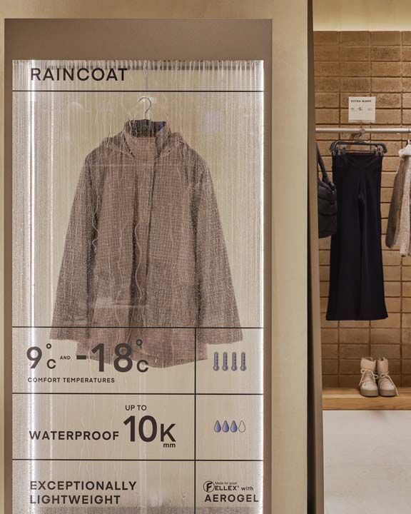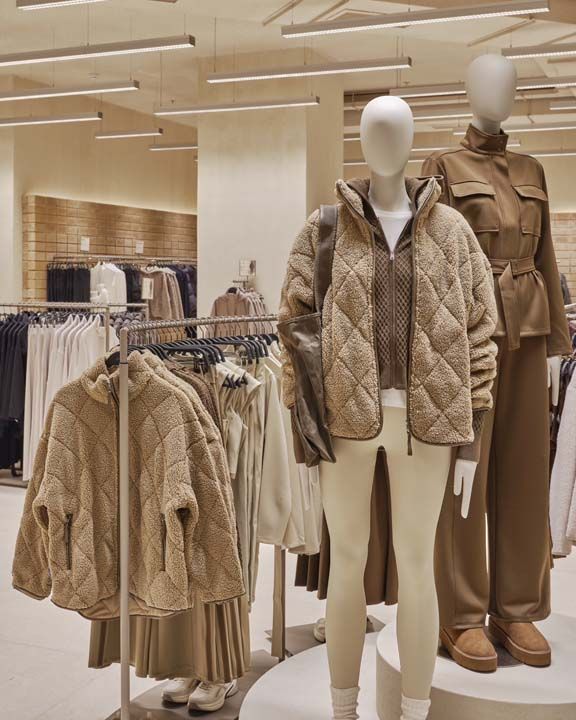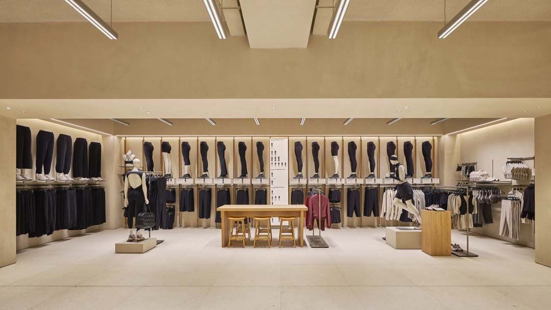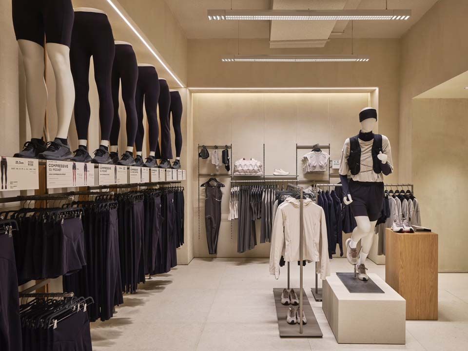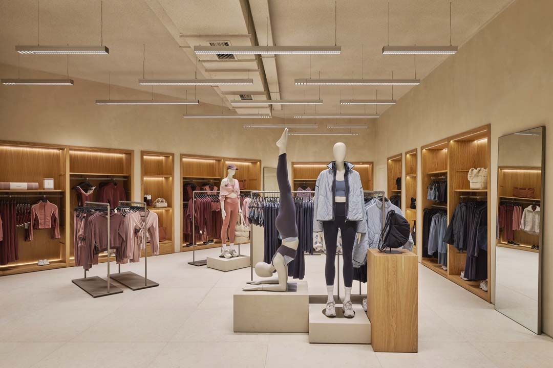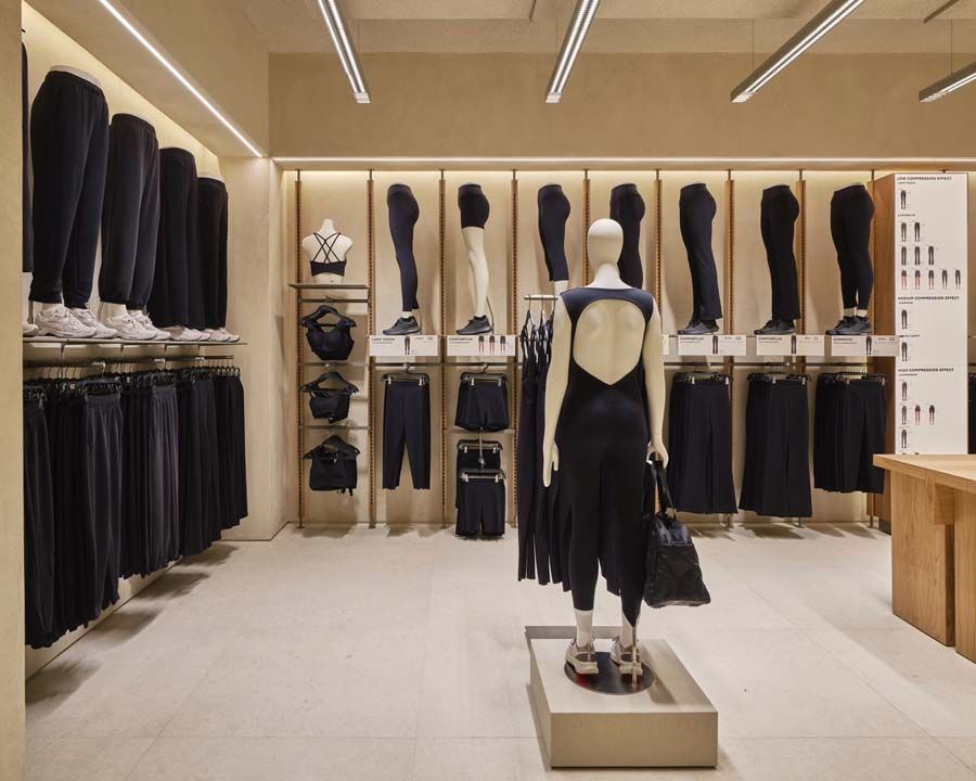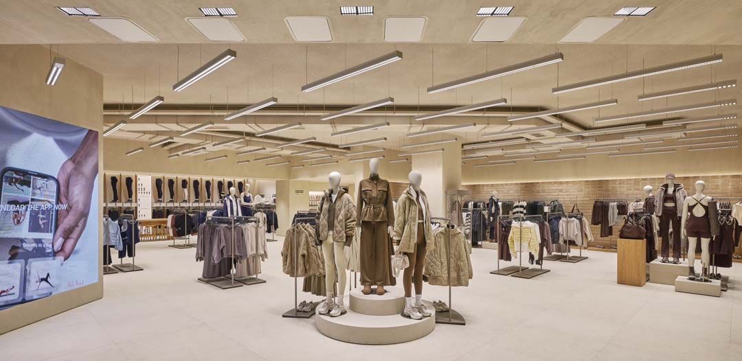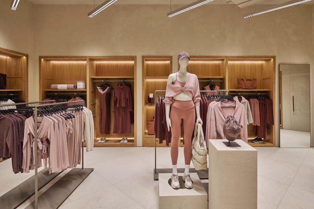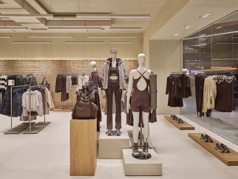 ด้านโครงสร้างสถาปัตยกรรมและวัสดุ ความอบอุ่น ผิวสัมผัสจากธรรมชาติ และแสงสว่าง คือองค์ประกอบสำคัญ ภายในร้านจึงเลือกใช้เป็นพื้นกระเบื้องพอร์ซเลนเพื่อให้เข้ากับวัสดุที่คัดสรรมาอย่างพิถีพิถัน โซนต้อนรับโดดเด่นด้วยผนัง earth-block งานแฮนด์คราฟต์ สะท้อนตัวตนของแบรนด์และชูภาพลักษณ์ความเป็นแบรนด์ผู้นำเทรนด์ Athleisure ตั้งแต่ก้าวแรกที่เข้าสู่ร้าน และไม้โอ๊คธรรมชาติ ถูกนำมาใช้เป็นองค์ประกอบหลักโดยรอบพื้นที่ ซึ่งช่วยเพิ่มสัมผัสที่ให้ความอบอุ่น ขณะที่แสงสว่างมีบทบาทสำคัญในการออกแบบครั้งนี้ ด้วยการเดินระบบไฟเส้นแบบต่อเนื่องที่ออกแบบพิเศษ สร้างบรรยากาศร่วมสมัยที่อบอุ่นและเป็นมิตร พร้อมนำสายตาไปตลอดเส้นทางการช้อปปิ้งภายในร้าน