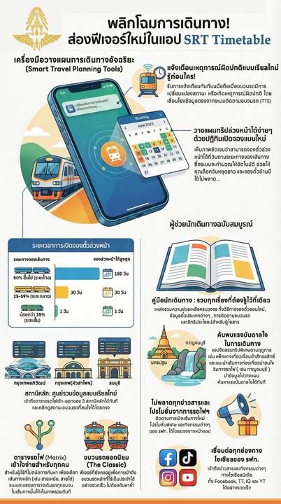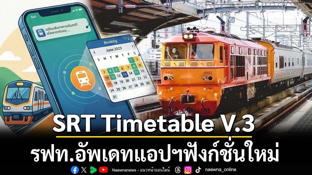30 มกราคม 2569 การรถไฟแห่งประเทศไทย ได้พัฒนาแอปพลิเคชัน “SRT Timetable” V.3 เวอร์ชั่นใหม่ล่าสุด ทันสมัย ตอบโจทย์กว่าเดิม เพื่อให้คุณไม่พลาดทุกความเคลื่อนไหว สามารถใช้ทั้งในระบบปฏิบัติการ Android และ IOS ช่วยให้การตรวจสอบเวลาขบวนรถและราคาค่าตั๋วโดยสาร รวมถึงข้อมูลต่าง ๆ เป็นเรื่องง่าย เพียงปลอยนิ้วสัมผัส โดยเริ่มใช้งานตั้งแต่วันนี้เป็นต้นไป