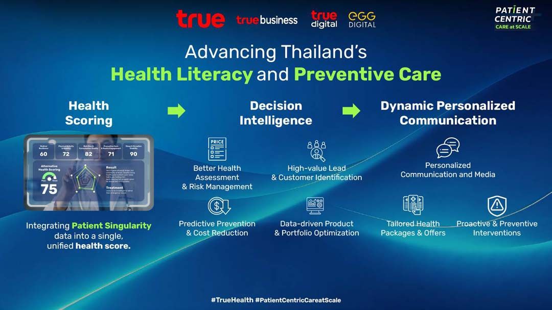 บมจ. ทรู คอร์ปอเรชั่น ได้เปิดหน้าประวัติศาสตร์สาธารณสุขไทยยุคใหม่ที่ขับเคลื่อนด้วยข้อมูล ผ่านการบรรยายในหัวข้อ “From Data to Health Scoring” มีหัวใจสำคัญ คือ “Patient Singularity” ที่หลอมรวมข้อมูลขนาดใหญ่ 1080° เข้ากับ AI และ Human Intelligence เชื่อมโยงข้อมูลในระบบสุขภาพทั้งจากโรงพยาบาลและการใช้ชีวิตประจำวันในมิติต่างๆ เพื่อยกระดับการดูแลสุขภาพได้แบบเฉพาะเจาะจงรายบุคคล พร้อมสร้างนิยามใหม่ของการดูแลสุขภาพเชิงป้องกัน ด้วยแนวคิด “Health Scoring” ดัชนีสุขภาพที่ทุกคนเข้าถึงได้ ทำให้คนไทยมี Health Literacy และสุขภาพดีถ้วนหน้า