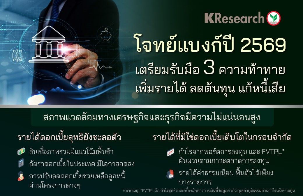อย่างไรก็ตาม ภาพของปี 2568 ถูกมองว่าเป็นเพียง “จุดตั้งต้นของความท้าทายที่หนักขึ้น” ในปี 2569 เนื่องจากสภาพแวดล้อมทางเศรษฐกิจและธุรกิจมีแนวโน้มซับซ้อนมากกว่าเดิม ทั้งจากเศรษฐกิจไทยที่ฟื้นตัวอย่างไม่ทั่วถึง ภาคครัวเรือนและเอสเอ็มอียังคงเปราะบาง ภาวะการเงินโลกที่ผันผวน รวมถึงการแข่งขันจากผู้ให้บริการทางการเงินนอกระบบธนาคาร (Non-bank) และแพลตฟอร์มดิจิทัลที่เข้ามาแย่งชิงรายได้ในหลายมิติ