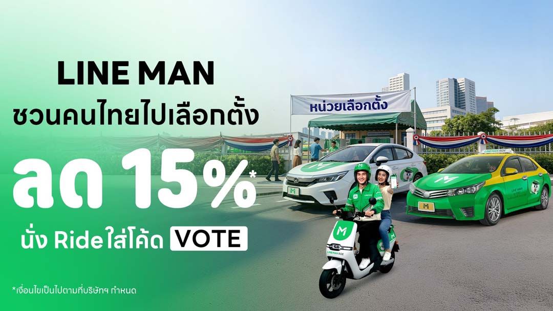 LINE MAN RIDE สนับสนุนคนไทยไปเลือกตั้งและออกเสียงประชามติในวันอาทิตย์ที่ 8 กุมภาพันธ์ 2569 พร้อมมอบ ส่วนลดค่าเดินทาง สำหรับผู้ใช้บริการเรียกรถผ่านแอปฯ เพื่ออำนวยความสะดวกให้การเดินทางไปใช้สิทธิเป็นเรื่องสะดวก และช่วยลดภาระค่าใช้จ่าย