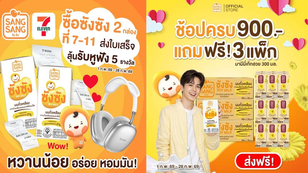 กุมภาพันธ์นี้มีแต่ความฟิน! นมถั่วเหลืองแบรนด์ ซังซัง ชวนทุกคนมาร่วมส่งต่อความอร่อยเพื่อลุ้นรางวัลใหญ่ Giftset Sangsang พร้อมหูฟัง Hoco มูลค่า 990 บาท จำนวน 5 รางวัล กติกาง่าย ๆ เพียงซื้อซังซัง ขนาด 300 มล. จำนวน 2 กล่อง ที่ 7-Eleven ทุกสาขา แล้วเขียนชื่อลงบนใบเสร็จให้ชัดเจน แล้วถ่ายรูปใบเสร็จให้เห็นรายการซื้อนมถั่วเหลืองซังซัง จากนั้นโพสต์รูปใบเสร็จพร้อมรีวิวความอร่อยชวนเพื่อน ๆ มาดื่มและบอกพิกัด 7-Eleven โซนที่ซื้อ ลงในคอมเมนต์ใต้โพสต์กิจกรรมเพื่อยืนยันการร่วมกิจกรรม โดยสามารถร่วมสนุกและโชว์รีวิวที่โดนใจที่สุดได้ตั้งแต่วันนี้ถึง 28 กุมภาพันธ์ 2569 ประกาศผลผู้โชคดีวันที่ 5 มีนาคม 2569 และยืนยันสิทธิ์ภายในวันที่ 10 มีนาคม 2569 ติดตามรายละเอียดเพิ่มเติมได้ที่ https://bit.ly/3w0PQ5o