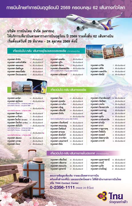 ผู้ที่สนใจสามารถสอบถามข้อมูลการเดินทางเพิ่มเติม รายละเอียดตารางการบิน พร้อมทั้งสำรองที่นั่งและออกบัตรโดยสารได้ที่สำนักงานขายการบินไทย หรือ THAI Contact Center 0-2356-1111 (ตลอด 24 ชั่วโมง)