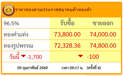 เมื่อ 5 กุมภาพันธ์ 2569 สมาคมค้าทองคำ รายงานตลาดราคาทองวันนี้ เมื่อเวลา 09.17 น. (ครั้งที่ 4) ปรับขึ้น 1,700 บาท โดยราคา ทองคำแท่ง รับซื้อ 73,800.00 บาท ขายออก 74,000.00 บาท ทองรูปพรรณ รับซื้อ 72,328.36 บาท ขายออก 74,800.00 บาท