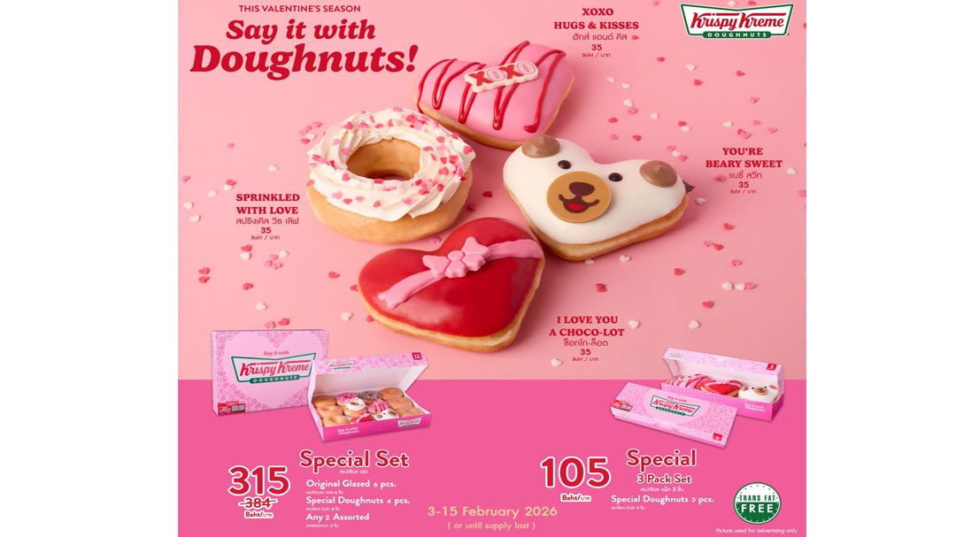 มอบโดนัทเป็นตัวแทนสื่อรักแทนใจในเทศกาลแห่งความรักนี้ด้วย “Krispy Kreme THIS VALENTINE'S SEASON Say it with Doughnuts” ในราคาเพียง ชิ้นละ 35 บาท หรือจะเลือกซื้อแบบเซตที่มาพร้อมกล่องลายลิมิเต็ดทั้งแบบแพ็ก 3 ในราคา 105 บาท (วาเลนไทน์ โดนัท 3 ชิ้น) หรือแบบเซต ในราคาเพียง 315 บาท (วาเลนไทน์ โดนัท 4 ชิ้น, แอสซอร์ทเตท 2 ชิ้น และออริจินอล เกลซ 6 ชิ้น) ตั้งแต่วันที่ 3 – 15 กุมภาพันธ์ 2569 ณ ร้านคริสปี้ ครีม ทุกสาขาใกล้บ้านคุณ (ราคาดังกล่าว ยกเว้น สาขาสนามบินสุวรรณภูมิ, สนามบินดอนเมือง และแอปพลิเคชัน ฟู้ดดิลิเวอรี)
