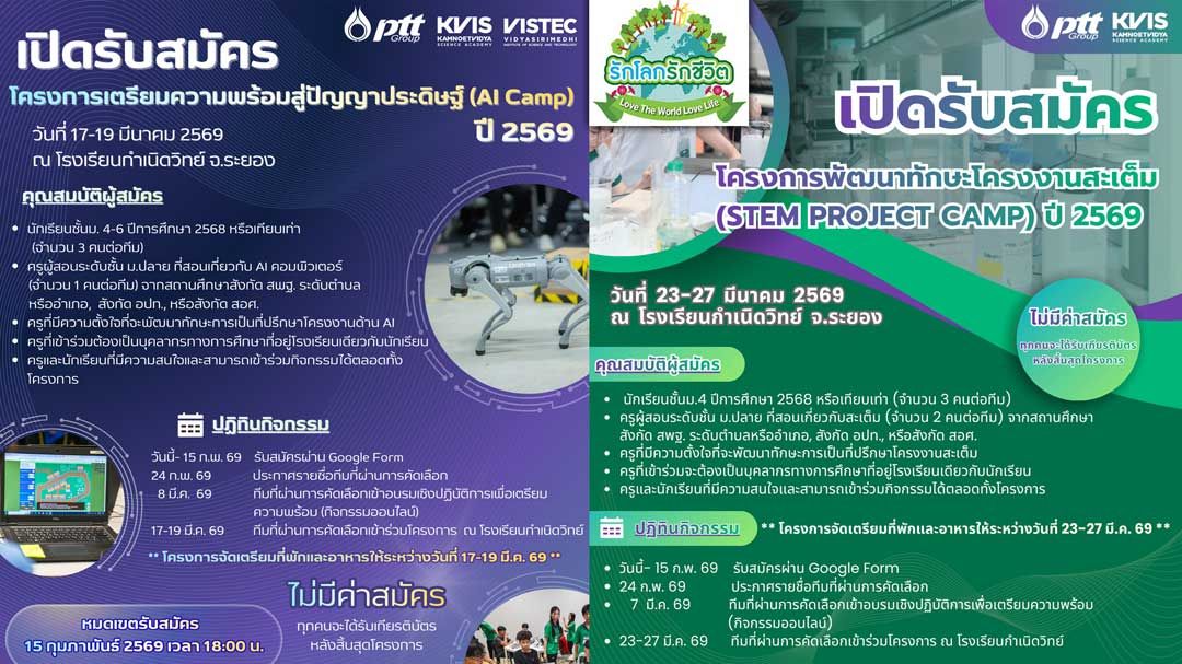 ขอเชิญโรงเรียนระดับชั้นมัธยมศึกษาตอนปลายทั่วประเทศ ร่วมสมัครเข้าร่วมโครงการเตรียมความพร้อมสู่ปัญญาประดิษฐ์ (AI Camp) และโครงการพัฒนาทักษะโครงงานสะเต็ม (STEM Project Camp) ประจำปี 2569 ที่จะสร้างแรงบันดาลใจให้นักเรียนและครูได้ค้นพบความสนใจด้านวิทยาศาสตร์และเทคโนโลยี พร้อมพัฒนาทักษะสำคัญผ่านกิจกรรมการเรียนรู้ที่สนุกและท้าทาย รวมถึงสถานการณ์จำลองที่ช่วยฝึกการคิดวิเคราะห์และการทำงานเป็นทีม ผู้สนใจสามารถสมัครเข้าร่วมโครงการฯ ได้โดยไม่เสียค่าใช้จ่าย โดยกิจกรรมจะจัดขึ้น ณ โรงเรียนกำเนิดวิทย์ จังหวัดระยอง
