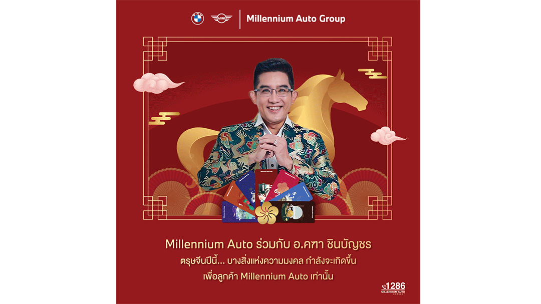 เสริมพลังแห่งโชคลาภ ต้อนรับปีม้าทอง ยังได้รับเกียรติจาก อาจารย์ คฑา ชินบัญชร ร่วมสร้างสรรค์คอนเทนต์มงคลผ่าน Lucky Mobile Wallpaper (ยันต์ดิจิทัลมหามงคล) ออกแบบเฉพาะตามวันเกิดทั้ง 7 วัน ถ่ายทอดแนวคิดเรื่องโชคลาภ ความสำเร็จและการเริ่มต้นปีใหม่อย่างมีพลัง มอบเป็นของขวัญแก่ลูกค้า บีเอ็มดับเบิลยู มิลเลนเนียม ออโต้ โดยสามารถติดตามรับชม หรือดาวน์โหลดยันต์ดิจิทัลมหามงคลได้จากโซเชียลมีเดียของ บีเอ็มดับเบิลยู มิลเลนเนียม ออโต้ ทุกช่องทาง