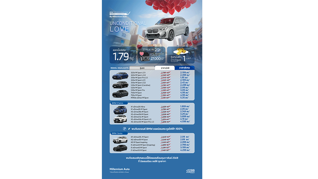 BMW มิลเลนเนียม ออโต้ ออกรถง่ายลุ้นรับทองเฮงรับปีม้าทอง วาเลนไทน์ปีนี้ อบอวลด้วยกลิ่นอายแห่งความรัก กับกิจกรรม ‘UNCONDITIONAL LOVE’ ระหว่างวันที่ 13-15 กุมภาพันธ์ 2569 ที่ เพลิดเพลินกับเวิร์กช็อปด้านศิลปะและความงาม พร้อมข้อเสนอพิเศษสำหรับลูกค้า บีเอ็มดับเบิลยู อาทิ ดอกเบี้ยพิเศษเริ่มต้น 1.99% สิทธิ์รับประกันภัยชั้นหนึ่งหรือ BSI Ultimate Upgrade รวมถึงสิทธิพิเศษสำหรับลูกค้าที่นำรถคันเก่ามาแลกรถใหม่ ห้ามพลาดกับกิจกรรมทดลองขับ BMW M2 LCI และ BMW XM ที่มีเฉพาะในงานนี้เท่านั้น