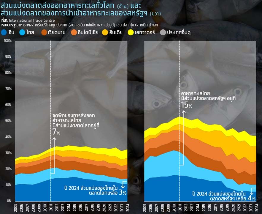 ศูนย์วิจัย Krungthai COMPASS ธนาคารกรุงไทย รายงานว่า ช่วงทศวรรษที่ผ่านมาไทยสูญเสียสถานะการเป็นผู้นำด้านการส่งออกอาหารทะเลในตลาดโลกและสหรัฐฯ ให้กับประเทศคู่แข่งอย่างเวียดนาม อินโดนีเซีย อินเดีย และเอกวาดอร์ จากต้นทุนการผลิตของไทยสูงกว่า ตลอดจนปัญหาเรื่องแรงงานผิดกฎหมาย โดยในปี 2024 ไทยมีส่วนแบ่งในตลาดสหรัฐฯ เหลือเพียง 4% (มูลค่า 1.1พันล้านดอลลาร์สหรัฐฯ) จาก 12-15% (มูลค่า 2.1 พันล้านดอลลาร์สหรัฐฯ) ในช่วงปี 2005-2011
