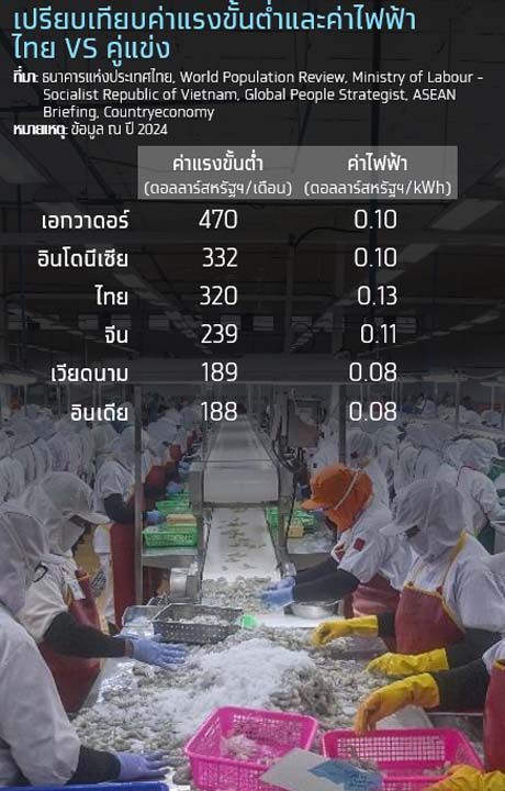 + ต้นทุนแรงงานที่ไทยเสียเปรียบต้นทุนแรงงานที่อินเดีย เวียดนาม และจีนอย่างมาก รวมทั้งผู้ประกอบการไทยยังต้องรับภาระต้นทุนแฝงเกี่ยวกับการจัดแรงงานจากกฎระเบียบที่เข้มงวด ซึ่งเกิดขึ้นจากในอดีตที่กระทรวงแรงงานสหรัฐฯ เคยจัดให้กุ้งไทยจัดอยู่ในบัญชีสินค้าที่มีการใช้แรงงานเด็กและแรงงานบังคับ (List of Goods Produced by Child Labor or Forced Labor) ในช่วงปี 2009-2024 และไทยเคยได้รับใบเหลือง Illegal, Unreported and Unregulated Fishing (IUU) หรือการแจ้งเตือนประเทศที่ทำการประมงผิดกฎหมายจากยุโรป ในช่วงปี 2015-2018 ส่งผลให้มีการบังคับใช้มาตรฐาน PIPO (Port-In Port-Out) และ GLP (Good Labour Practices) ในการจัดการแรงงานในอุตสาหกรรมประมงไทย ซึ่งเป็นการเพิ่มต้นทุนให้ผู้ประกอบการ