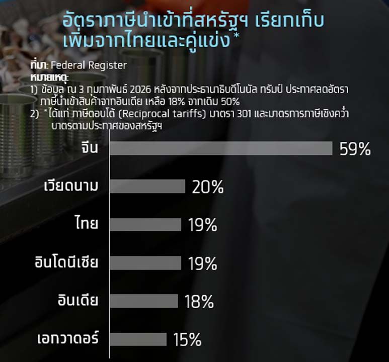 + ปลาทูน่ากระป๋อง: ไทยเป็นประเทศที่มีฐานความสามารถในการแข่งขันอยู่แล้ว เดิมมีราคาก่อนภาษีอยู่ในระดับกลางเมื่อเทียบกับคู่แข่งอีก 4 ประเทศ (ไม่พิจารณาอินเดีย เนื่องจากมีมูลค่าการส่งออกน้อย) หลังการเพิ่มภาษีนำเข้าของสหรัฐฯ ส่งผลให้อันดับราคาของไทยจากลำดับ 3 รองจากอินโดนีเซียและจีน ขึ้นมาเป็นลำดับ 2 รองจากอินโดนีเซีย และส่วนต่างราคาระหว่างไทยกับประเทศที่มีราคาถูกที่สุดในกลุ่มหลังการเพิ่มภาษีนั้นลดลงถึง 92%