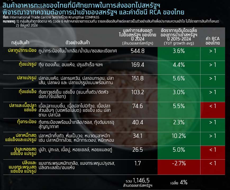 Krungthai COMPASS ประเมินโอกาสของผู้ประกอบการไทยในการส่งออกอาหารทะเลไทย ไปยังสหรัฐฯ โดยพิจารณา 9 กลุ่มสินค้าอาหารทะเลที่ไทยมีการส่งออกในช่วง 10 ปีที่ผ่านมา (2015-2024) พบว่า อาหารทะเลไทย 2 กลุ่ม ได้แก่ ปลาทูน่ากระป๋องและกุ้งแปรรูป เป็นกลุ่มที่มีศักยภาพ โดยทำการพิจารณาจาก 3 ปัจจัย ได้แก่