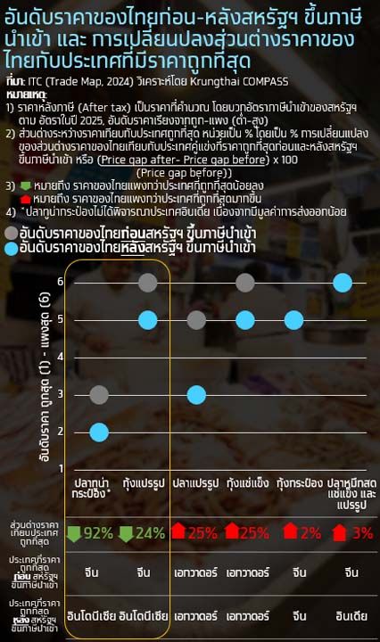 + กุ้งแปรรูป: เดิมราคากุ้งแปรรูปของไทยอยู่ลำดับสุดท้ายของกลุ่ม (แพงที่สุด) แต่หลังการเพิ่มภาษีนำเข้าของสหรัฐฯ ราคาของไทยขยับอันดับจากอันดับ 6 ขึ้นมาเป็นอันดับ 5 จากการที่อินเดียตกลงมาเป็นลำดับสุดท้ายของกลุ่ม อีกทั้งราคาส่วนต่างระหว่างไทยกับประเทศที่มีราคาถูกที่สุดในกลุ่มหลังการเพิ่มภาษีนั้นลดลง 24%
