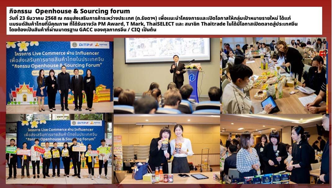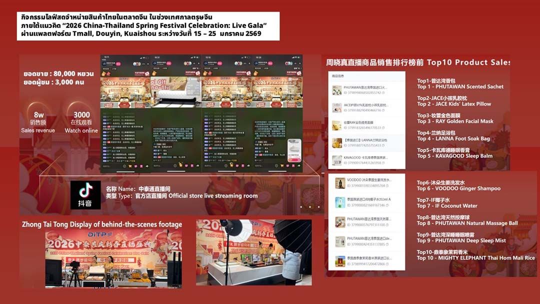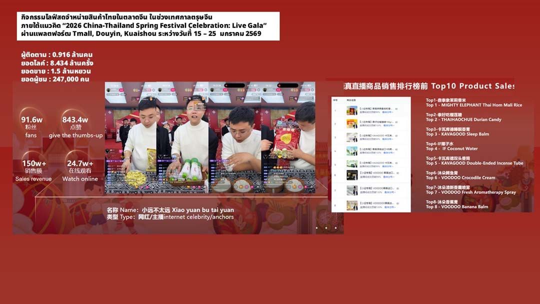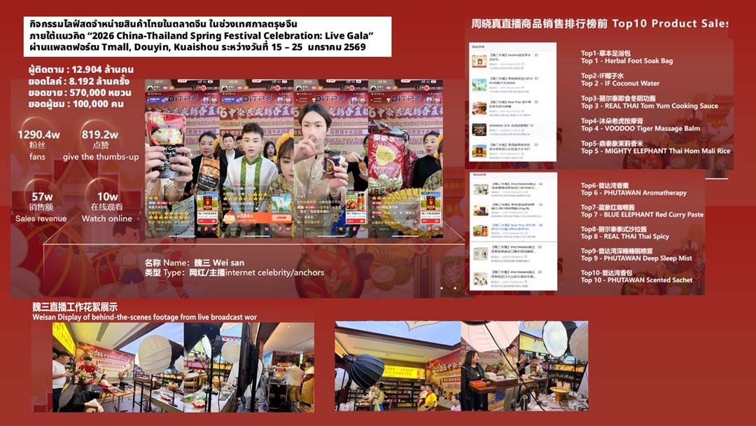 สำหรับการถ่ายทอดสดจำหน่ายสินค้าไทย กรมฯ ได้เชิญ KOL เข้าร่วมดำเนินกิจกรรมบนแพลตฟอร์มหลักทั้ง 3 แพลตฟอร์ม เช่น Douyin KOL : Wei San ผู้ติดตาม 12.904 ล้านคน, Zhou Xiaozhen ผู้ติดตาม 1.718 ล้านคนTmall KOL : Mi feng huan le she ผู้ติดตาม 6.254 ล้านคน และ Kuaishou KOL : Xiao yuan bu tai yuan ผู้ติดตาม 0.916 ล้านคน เป็นต้น โดยจัดการถ่ายทอดสดอย่างต่อเนื่องเป็นระยะเวลา 10 วัน ระหว่างวันที่ 15–25 มกราคม 2569 ซึ่งได้รับความสนใจจากผู้บริโภคชาวจีนเป็นจำนวนมาก บรรยากาศการจำหน่ายเป็นไปอย่างคึกคัก ส่งผลให้เกิดการตัดสินใจสั่งซื้อสินค้าไทยในระดับสูง