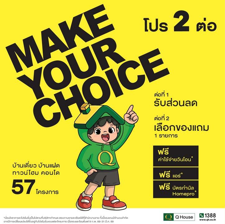 บริษัท ควอลิตี้เฮ้าส์ จำกัด (มหาชน) ผู้พัฒนาอสังหาริมทรัพย์ชั้นนำ เปิดเผยว่า ล่าสุดได้จัดแคมเปญ “MAKE YOUR CHOICE โปร 2 ต่อ” เพื่อกระตุ้นยอดขายไตรมาส 1 ปี 2569 กับโครงการที่อยู่อาศัยพร้อมอยู่ จำนวน 57 โครงการ ทั้งบ้านเดี่ยว บ้านแฝด ทาวน์โฮม และคอนโดมิเนียม ภายใต้แบรนด์ คิวเฮ้าส์ ลัดดารมย์ วรารมย์ คาซ่า Q District Q Prime กัสโต้ เดอะทรัสต์ และเดอะพอยต์ ของบริษัทฯ และบริษัทในเครือ บนทำเลศักยภาพ กรุงเทพ ปริมณฑล ชลบุรี และเชียงใหม่