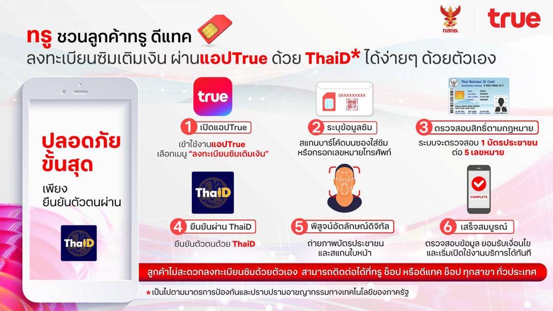 ซิมด้วยเครื่องอ่านบัตรประชาชน (Smart Card Reader) และอำนวยความสะดวกให้ลูกค้าสามารถลงทะเบียนซิมเติมเงินได้ด้วยตัวเองง่ายๆ ทุกที่ ทุกเวลา ผ่านแอปTrue ที่จะยืนยันตัวตนด้วยThaiD ซึ่งจะช่วยเพิ่มความปลอดภัยในการใช้งาน เป็นเกราะป้องกันภัยจากมิจฉาชีพที่แข็งแกร่ง พร้อมมอบประสบการณ์ดิจิทัลที่ใช้งานง่าย เชื่อถือได้ และมั่นใจได้เสมือนการติดต่อทำรายการด้วยตนเองที่ช็อป ลูกค้าทรู ดีแทค เริ่มใช้งานได้แล้ววันนี้