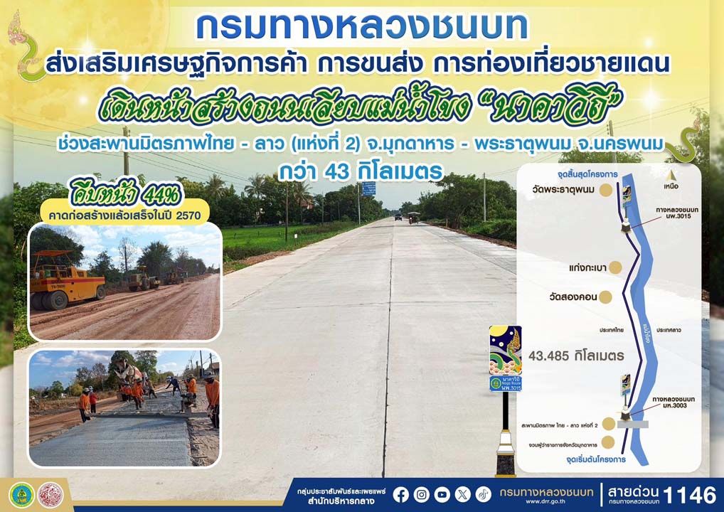 ‘กรมทางหลวงชนบท’ส่งเสริมเศรษฐกิจการค้า การขนส่ง การท่องเที่ยวชายแดน เดินหน้าสร้าง‘ถนนเลียบแม่น้ำโขงนาคาวิถี’ ช่วงสะพานมิตรภาพไทย - ลาว(แห่งที่ 2)-พระธาตุพนม จ.มุกดาหาร-นครพนม กว่า 43 กิโลเมตร คืบหน้า 44% คาดก่อสร้างแล้วเสร็จในปี 2570