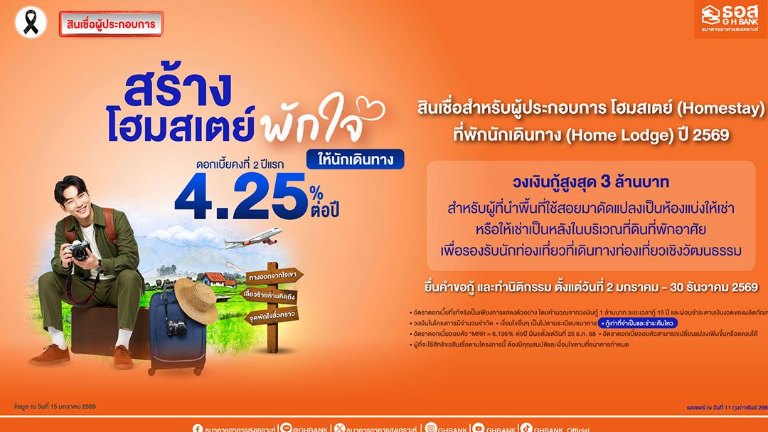 ธนาคารอาคารสงเคราะห์ (ธอส.) สนับสนุนการกระจายรายได้สู่ท้องถิ่น เพิ่มมูลค่าทางเศรษฐกิจในชุมชน และสนับสนุนผู้ประกอบการรายย่อยให้สามารถดำเนินธุรกิจได้อย่างมั่นคง โดยจัดทำโครงการสินเชื่อสำหรับผู้ประกอบการโฮมสเตย์ (Homestay) ที่พักนักเดินทาง (Home Lodge) ปี 2569 สำหรับผู้ที่นำพื้นที่ใช้สอยมาดัดแปลงเป็นห้องแบ่งให้เช่า หรือให้เช่าเป็นหลังในบริเวณที่ดินที่พักอาศัย เพื่อรองรับนักท่องเที่ยวที่เดินทางท่องเที่ยวเชิงวัฒนธรรม