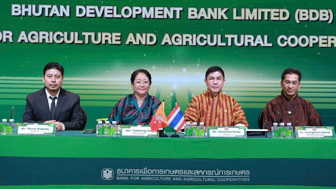 นายฉัตรชัย ศิริไล ผู้จัดการธนาคารเพื่อการเกษตรและสหกรณ์การเกษตร (ธ.ก.ส.) และ Ms. Tshering Om CEO Development Bank Limited (BDB) ร่วมลงนามบันทึกความเข้าใจระหว่าง ธ.ก.ส. และธนาคารเพื่อการพัฒนาภูฏาน จำกัด เพื่อยกระดับการพัฒนาและเชื่อมโยงธุรกิจอย่างเป็นระบบ ควบคู่กับการเพิ่มประสิทธิภาพการทำธุรกรรมโอนเงินระหว่างประเทศ การสนับสนุนสินเชื่อเพื่อธุรกิจการเกษตร ธุรกิจวิสาหกิจขนาดกลางและขนาดย่อย (Agri-SME) และการอำนวยความสะดวกให้แก่ผู้ประกอบการและธุรกิจการค้าในระดับสากลให้มีความคล่องตัว รวดเร็ว และปลอดภัย รวมถึงการแลกเปลี่ยนองค์ความรู้และเครือข่ายทางธุรกิจ เพื่อรองรับการขยายตัวของการลงทุนและการค้าระหว่างไทยและภูฏานในอนาคต