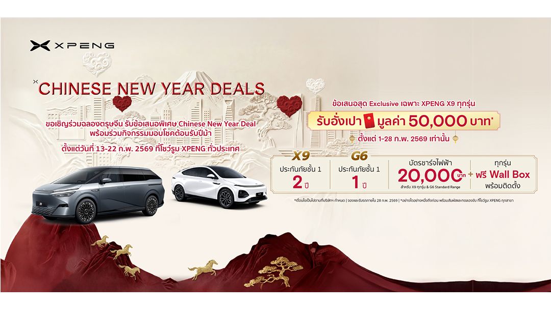 สัมผัสและทดลองขับ เอ็กซ์เผิง พร้อมร่วมกิจกรรม ‘XPENG Chinese New Year Deal’ ระหว่างวันที่ 13-22 ก.พ. 2569 ที่โชว์รูมเอ็กซ์เผิง ทุกสาขาทั่วประเทศ หรือ โทร. 1526 , Facebook: xpeng Thailand www.xpeng.co.th