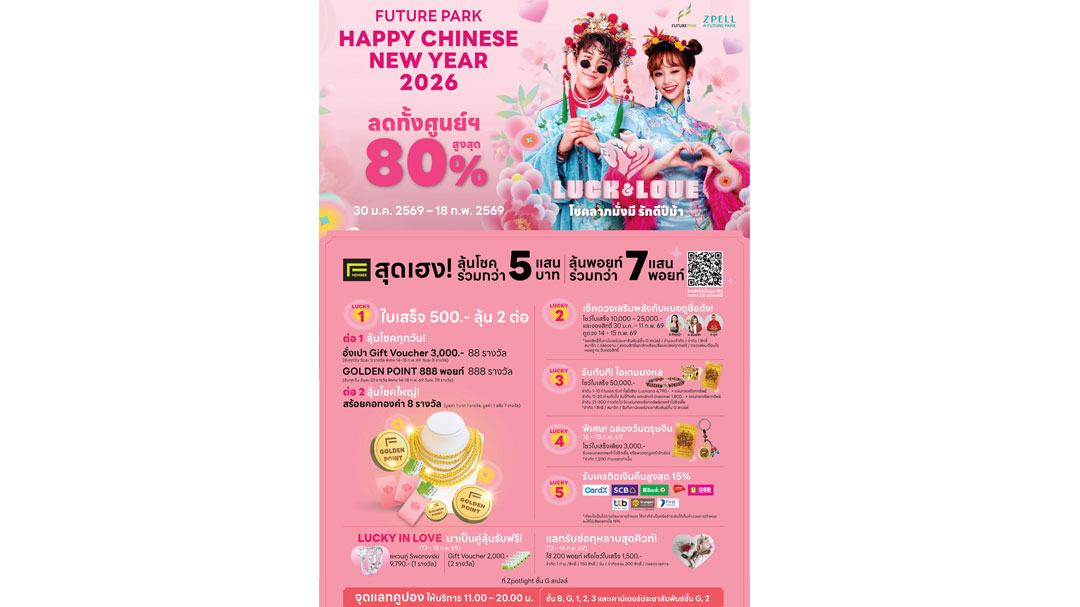 จัดแคมเปญ “HAPPY CHINESE NEW YEAR 2026” ตั้งแต่วันนี้ถึง 18 กุมภาพันธ์ 2569 ที่ศูนย์การค้าฟิวเจอร์พาร์คและสเปลล์ ลดทั้งศูนย์การค้าสูงสุด 80% พร้อมเสิร์ฟความ LUCKY เตรียมลุ้นโชคใหญ่แบบจัดเต็ม พิเศษ! สำหรับ F-MEMBER ลุ้นโชครวมกว่า 500,000 บาท และลุ้นพอยท์รวมกว่า 700,000 พอยท์ อาทิ เมื่อโชว์ใบเสร็จ 500 บาท ลุ้นโชคทันที 2 ต่อ ต่อที่ 1 ลุ้นอั่งเปา Gift Voucher 3,000 บาท (รวม 88 รางวัล) GOLDEN POINT 888 พอยท์ (รวม 888 รางวัล) ต่อที่ 2 ลุ้นสร้อยคอทองคำ จำนวน 8 รางวัล (1 บาท 1 รางวัล, 1 สลึง 7 รางวัล) โชว์ใบเสร็จเพียง 3,000 บาท รับทันที! แผ่นทองเทพเจ้าไฉ่ซิงเอี๊ย หรือพวงกุญแจปีนักษัตร (จำกัด 1,200 ท่านแรก) รับเครดิตเงินคืนสูงสุด 15% จากบัตรเครดิตชั้นนำ