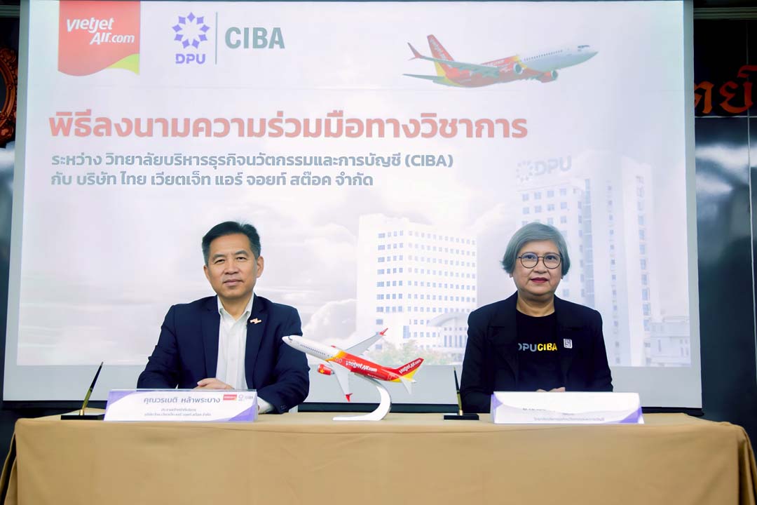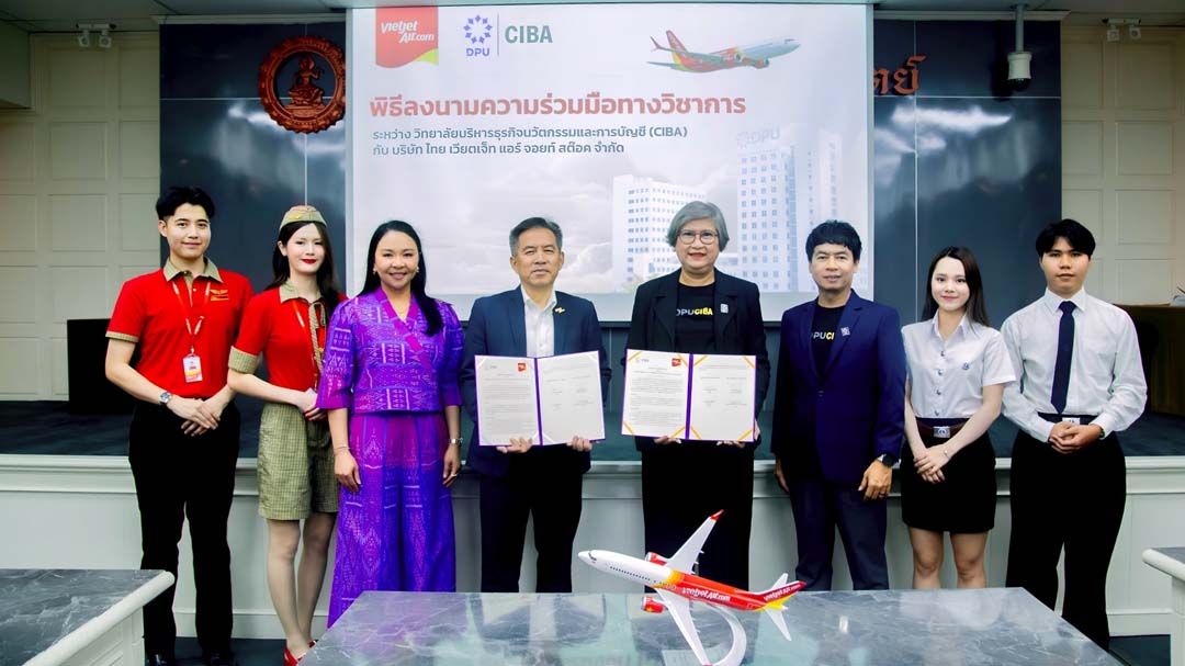 เวียตเจ็ทไทยแลนด์ ลงนามบันทึกข้อตกลงความร่วมมือกับวิทยาลัยบริหารธุรกิจนวัตกรรมและการบัญชี (CIBA) มหาวิทยาลัยธุรกิจบัณฑิตย์ (DPU) เพื่อยกระดับการเรียนรู้สู่การพัฒนาบุคลากรอุตสาหกรรมการบินอย่างเป็นระบบ ครอบคลุมโครงการฝึกงานและสหกิจศึกษา การพัฒนาหลักสูตรจากโจทย์ธุรกิจจริง การจัดทำฐานข้อมูลและกลไกจับคู่งาน ตลอดจนหลักสูตรอบรมระยะสั้นด้านธุรกิจและดิจิทัลสำหรับบุคลากรองค์กร พิธีลงนามจัดขึ้น ณ มหาวิทยาลัยธุรกิจบัณฑิตย์ สะท้อนความมุ่งมั่นร่วมกันในการพัฒนาทรัพยากรมนุษย์อย่างยั่งยืน