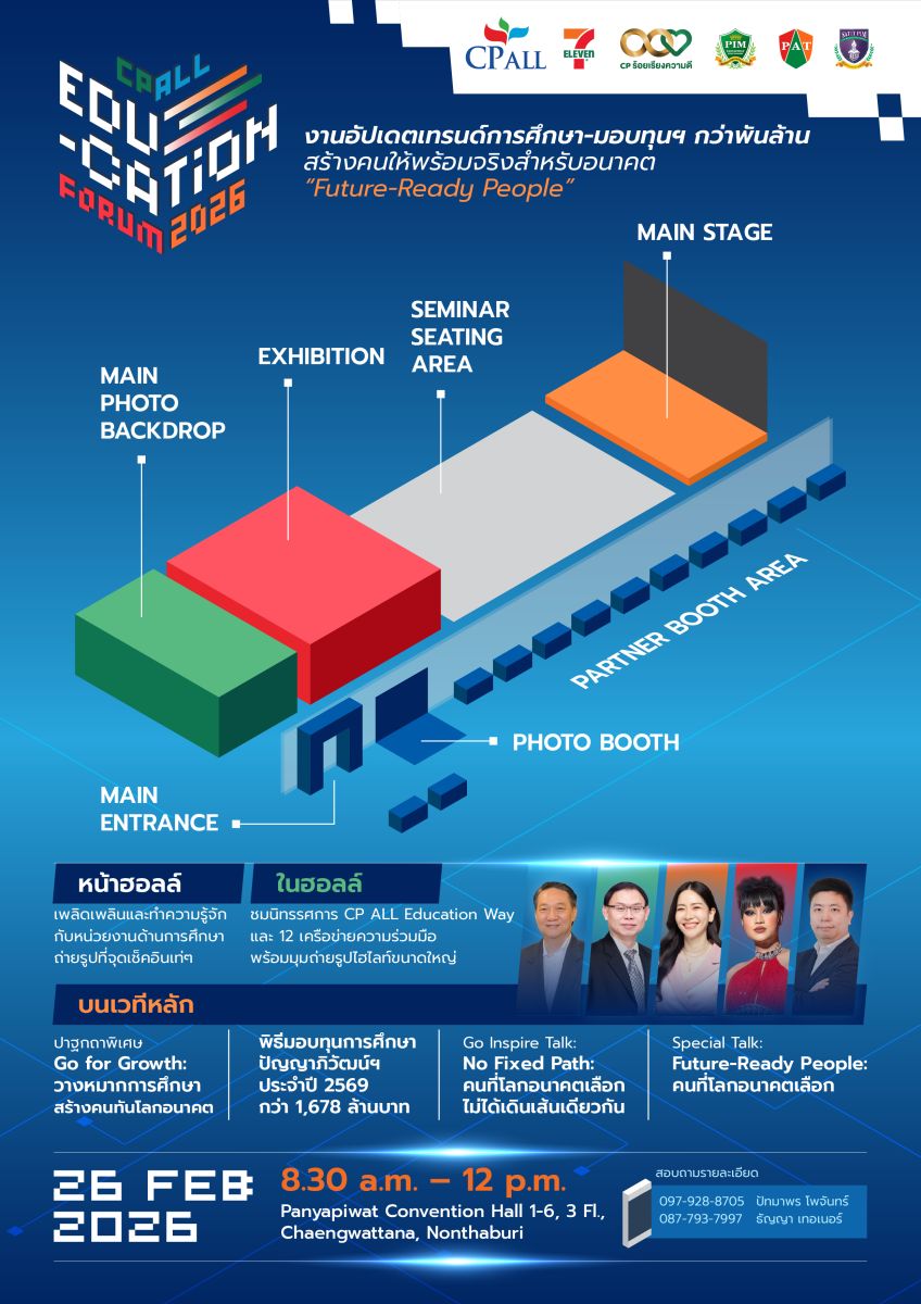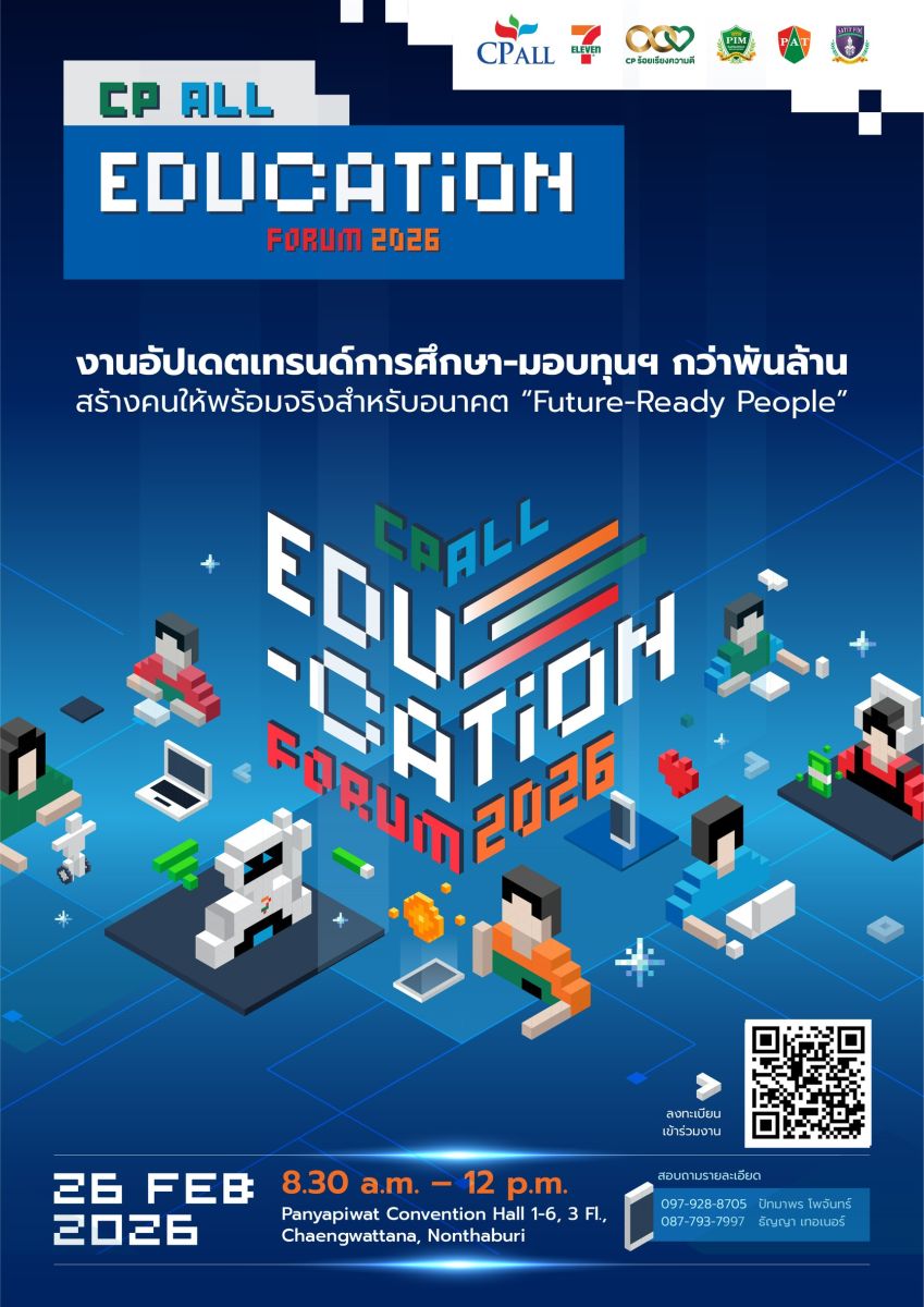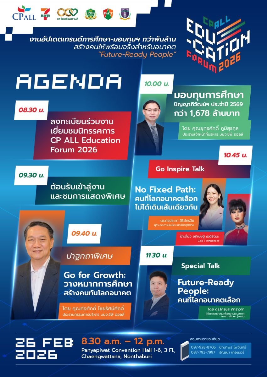 ผู้สนใจสามารถเข้าร่วมงาน CP ALL Education Forum 2026 วันพฤหัสบดี ที่ 26 กุมภาพันธ์ 2569 เวลา 08.30 – 12.00 น. ณ ฮอลล์ 1–6 ชั้น 3 อาคารหอประชุม สถาบันการจัดการปัญญาภิวัฒน์ จังหวัดนนทบุรี เพื่อร่วมค้นหาคำตอบว่า การศึกษาไทยจะเตรียมคนอย่างไร ที่ไม่จำเป็นต้องวิ่งตามโลก แต่สามารถออกแบบคนที่โลกต้องการ