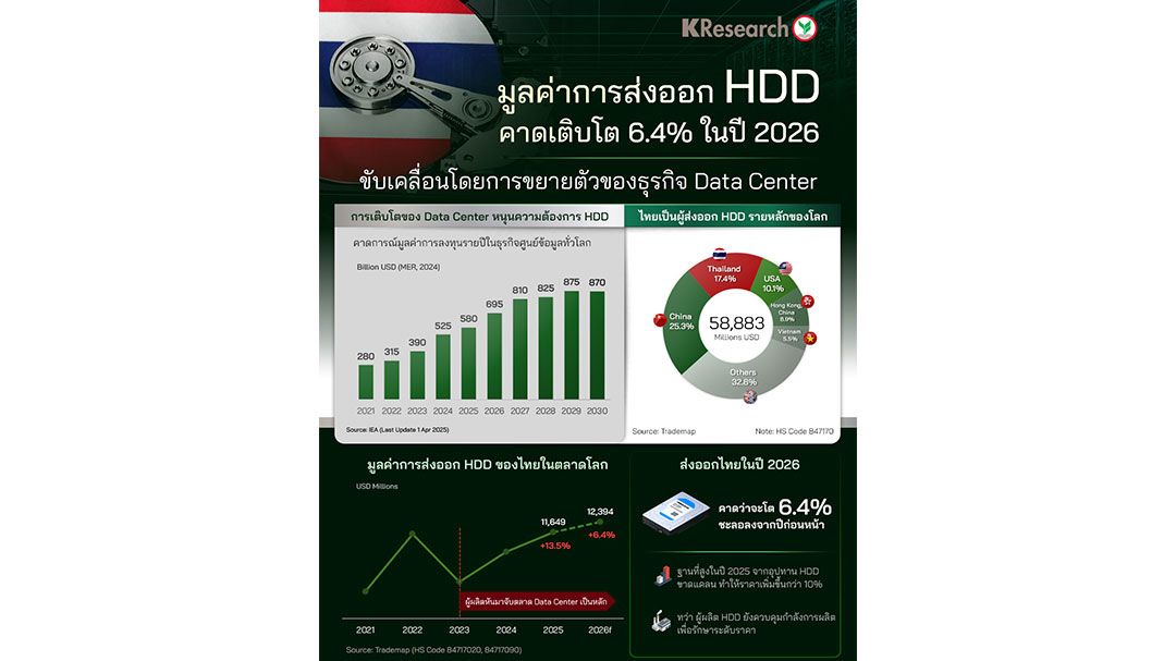 ศูนย์วิจัยกสิกรไทย รายงานว่า เเนวโน้มมูลค่าการส่งออก HDD (Hard Disk Drive) ของไทยในปี 2026 คาดว่าจะขยายตัวราว 6.4% ตามการเติบโตต่อเนื่องของธุรกิจ Data Center ทั่วโลก