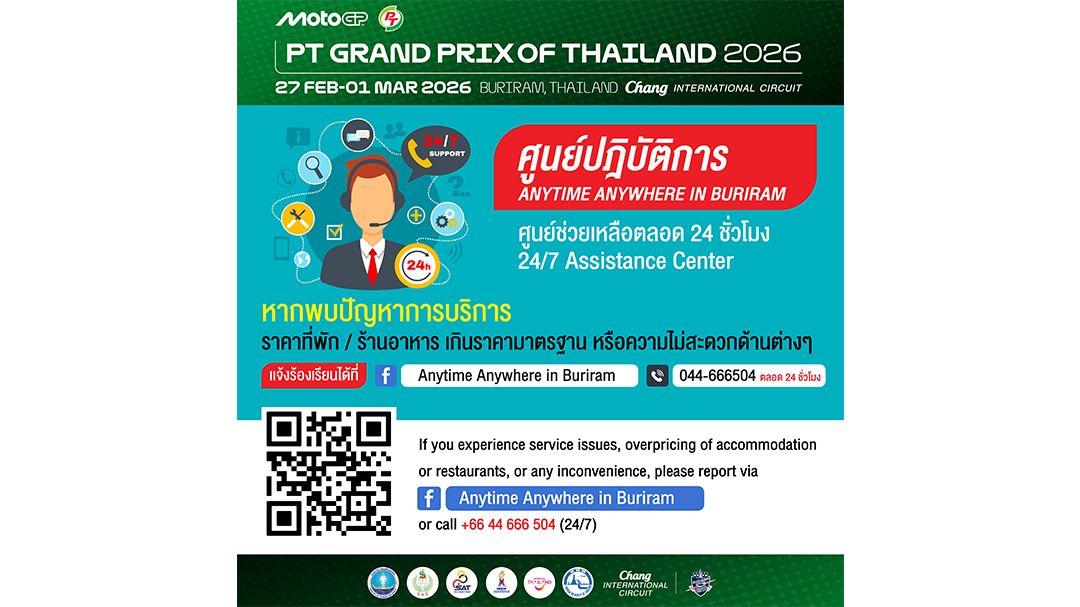 นักท่องเที่ยวชาวไทย และชาวต่างชาติ ที่เดินทางมายังจังหวัดบุรีรัมย์ เพื่อร่วมชมงาน MotoGP รายการ PT Grand Prix of Thailand 2026 (ระหว่างวันที่ 27 ก.พ. – 1 มี.ค.) หากพบปัญหาในการบริการ / ราคาที่พัก หรือ สิ่งอำนวยความสะดวก ในด้านต่างๆ เช่น โรงแรม ที่พัก ร้านอาหาร ขึ้นราคาเกินมาตรฐาน หรือ ไม่ได้รับการบริการที่เหมาะสม รวมถึงความไม่สะดวกด้านอื่นๆ