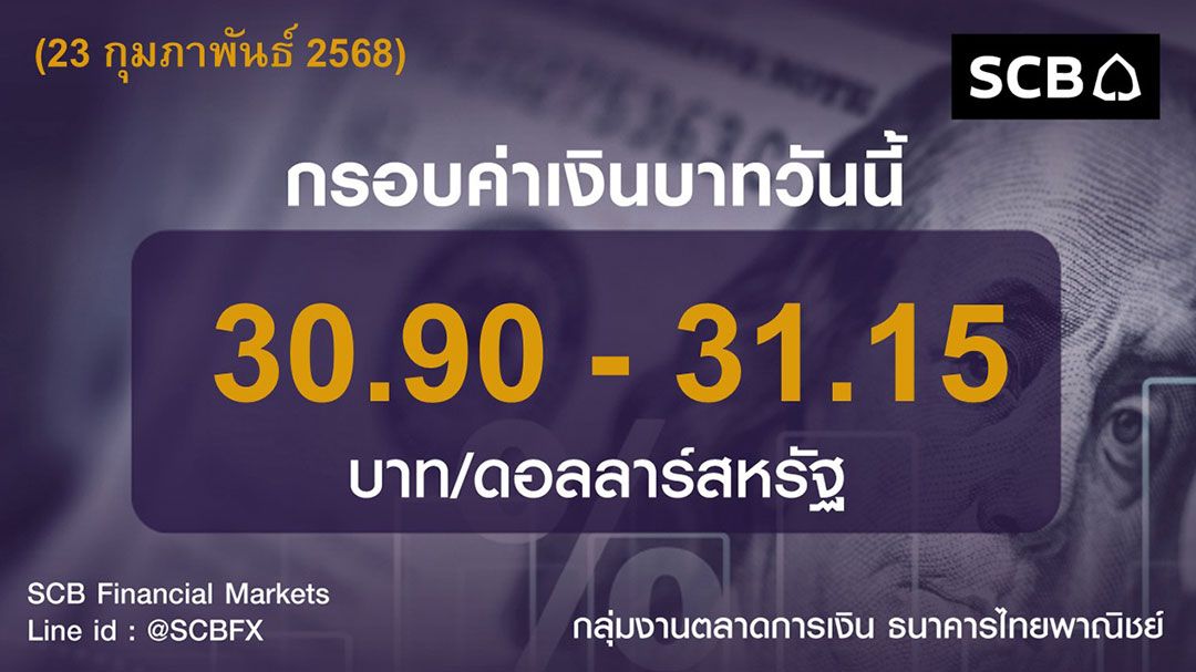 • กลุ่มงานตลาดการเงิน ธนาคารไทยพาณิชย์ (SCB Financial Markets)ประเมินค่าเงินบาทวันนี้เคลื่อนไหวในกรอบ 30.90-31.15บาท/ดอลลาร์