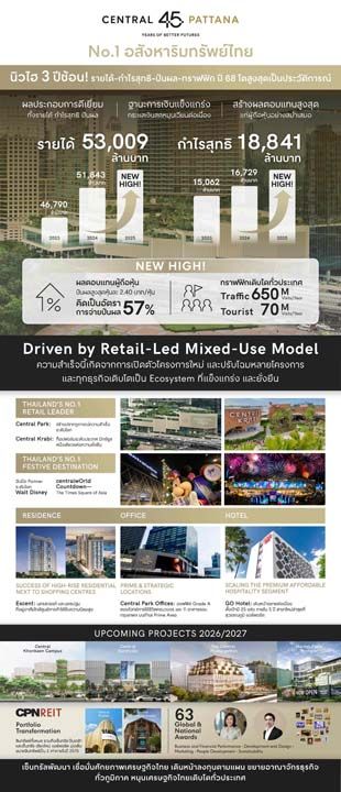 ด้านนางสาวนภารัตน์ ศรีวรรณวิทย์ ประธานเจ้าหน้าที่บริหารการเงิน และกรรมการผู้จัดการใหญ่ กลุ่มงานการเงินการบัญชี และกลุ่มธุรกิจโรงแรมและสำนักงาน บมจ.เซ็นทรัลพัฒนา กล่าวว่า ผลประกอบการใน ปี 2568 ของบริษัทฯ เติบโตในทุกกลุ่มธุรกิจ ทั้งศูนย์การค้า โครงการที่อยู่อาศัย อาคารสำนักงาน และโรงแรมทั่วประเทศ โดยบริษัทฯ ได้รายงานงบการเงินปี 2568 มีรายได้รวมที่ 53,009 ล้านบาท กำไรสุทธิ 18,841 ล้านบาท เติบโต 13% จากปีก่อนหน้า สร้างผลตอบแทนแก่ผู้ถือหุ้น พร้อมประกาศจ่ายปันผลสูงสุดหุ้นละ 2.40 บาทต่อหุ้น* หรือคิดเป็นอัตราส่วนการจ่ายปันผลที่ 57% โดยบริษัทฯ มีฐานะทางการเงินแข็งแกร่ง และยังคงเดินหน้าลงทุนตามแผนเพื่อสร้างการเติบโตและผลตอบแทนที่ยั่งยืนแก่ผู้ถือหุ้น ภายใต้วินัยทางการเงินที่มีประสิทธิภาพ และกลยุทธ์การดำเนินธุรกิจที่มุ่งสร้างคุณค่าให้กับ Stakeholders ทุกฝ่าย” (*ตัวเลขเพื่อนำเสนอและรอการอนุมัติจากผู้ถือหุ้น)
