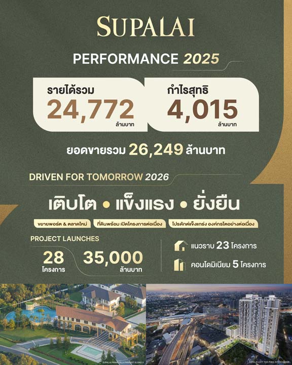 นายไตรเตชะ ตั้งมติธรรม กรรมการผู้จัดการ บริษัท ศุภาลัย จำกัด (มหาชน) กล่าวว่า ภาพรวมการดำเนินงานปี 2568 เป็นอีกบทพิสูจน์ถึงความแข็งแกร่งของบริษัทฯ แม้ตลาดอสังหาริมทรัพย์ยังเผชิญความผันผวนจากกำลังซื้อและภาวะเศรษฐกิจ แต่บริษัทฯ ยังสามารถรักษาเสถียรภาพรายได้และกำไรได้อย่างต่อเนื่อง จากการบริหารพอร์ตโครงการอย่างสมดุลทั้งในกรุงเทพฯ ปริมณฑล และภูมิภาค ควบคู่การขยายการลงทุนในต่างประเทศ ส่งผลให้บริษัทฯ มีรายได้รวม 24,772 ล้านบาท และกำไรสุทธิ 4,015 ล้านบาท