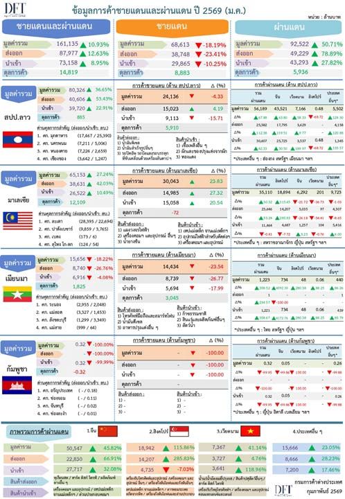 อธิบดีกรมการค้าต่างประเทศ กล่าวว่า การค้าชายแดนและผ่านแดนของไทยเริ่มต้นปี 2569 ในแดนบวก จากแรงขับเคลื่อนของการค้าผ่านแดนที่ขยายตัว 50.7% และการส่งออกขยายตัวสูงถึง 78.9% โดยการส่งออกผ่านแดนไปยังตลาดหลักขยายตัวทั้ง 3 ตลาด ได้แก่ จีน มูลค่าส่งออก 22,830 ล้านบาท ขยายตัว 66.9% จากสินค้าสำคัญ เช่น ทุเรียนสด 6,567 ล้านบาท (+682.7%) และฮาร์ด ดิสก์ ไดรฟ์ 5,182 ล้านบาท (+97.7%) สิงคโปร์ มูลค่าการส่งออก 14,207 ล้านบาท ขยายตัว 285.8% จากสินค้าสำคัญ เช่น เครื่องรับโทรศัพท์และอุปกรณ์ 6,761 ล้านบาท (+6,924.1%) และเครื่องคอมพิวเตอร์และอุปกรณ์ อื่น ๆ 1,649 ล้านบาท (+218.6) และเวียดนาม มูลค่าการส่งออก 3,727 ล้านบาท ขยายตัว 4.8% จากสินค้าสำคัญ เช่น น้ำแร่น้ำอัดลมที่ปรุงรส 1,015 ล้านบาท (+51.6%) และสินค้าปศุสัตว์อื่น ๆ 876 ล้านบาท (+55.5%)