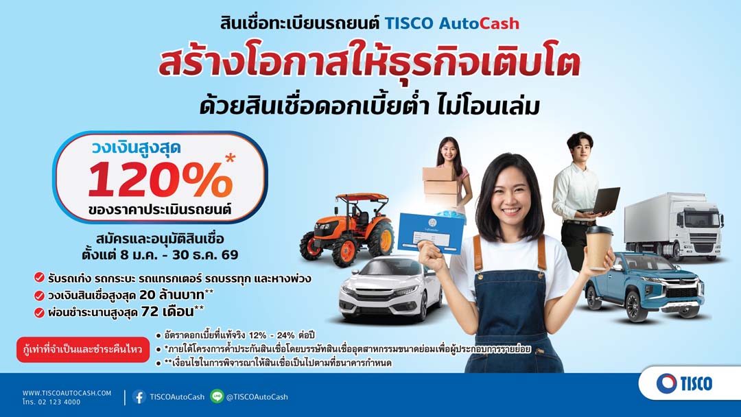 25 กุมภาพันธ์ 2569 ธนาคารทิสโก้ พร้อมยืนเคียงข้างผู้ประกอบการรายย่อยและกลุ่มอาชีพอิสระให้เข้าถึงเงินทุนหมุนเวียนง่ายขึ้น ผ่านสินเชื่อจำนำทะเบียนรถทุกประเภท TISCO Auto Cash ด้วยวงเงินสูงสุด 120% ผ่อนสบายสูงสุด 72 เดือน ไม่ต้องโอนเล่ม รวมถึงเข้าร่วมโครงการค้ำประกันสินเชื่อ SMEs Quick Big Win มาตรการ SMEs Go Big และ SMEs Smart Win ของบรรษัทประกันสินเชื่ออุตสาหกรรมขนาดย่อม (บสย.) เพื่อสนับสนุนให้ผู้ประกอบการสามารถเข้าถึงแหล่งเงินทุนในระบบได้ง่ายขึ้น ท่ามกลางสภาวะเศรษฐกิจที่ยังท้าทาย สามารถสมัครได้ตั้งแต่วันนี้ถึง 30 ธ.ค. 69 ที่ธนาคารทิสโก้ และ สมหวัง เงินสั่งได้ ทุกสาขาทั่วประเทศ