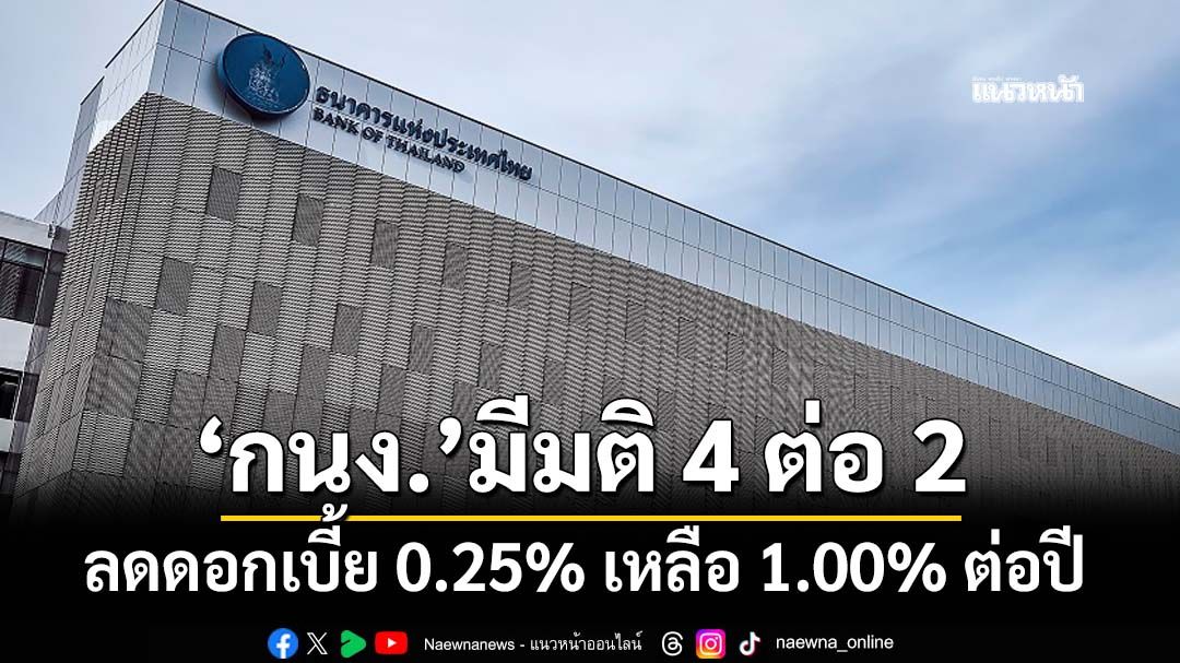 ‘กนง.’มีมติ 4 ต่อ 2 ลดดอกเบี้ย 0.25% เหลือ 1.00% ต่อปี