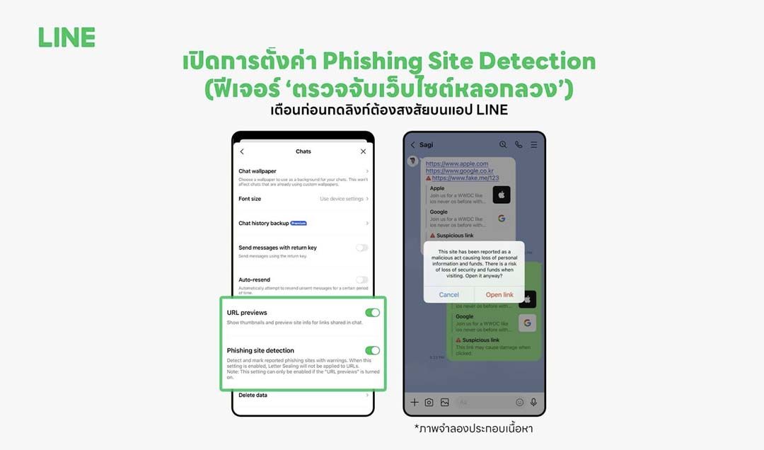 นอกเหนือจากความสะดวกในการใช้งาน LINE ยังให้ความสำคัญกับความปลอดภัยของผู้ใช้ ผ่านฟีเจอร์ ‘Phishing Site Detection หรือระบบตรวจจับเว็บไซต์หลอกลวง ซึ่งช่วยคัดกรองและแจ้งเตือนเมื่อผู้ใช้กดลิงก์ที่อาจเป็นอันตรายจากในแชท เมื่อระบบตรวจพบความเสี่ยง หน้าจอจะแสดงคำเตือนก่อนเปิดเว็บไซต์ เพื่อให้ผู้ใช้พิจารณาอย่างรอบคอบ ลดโอกาสตกเป็นเหยื่อของมิจฉาชีพออนไลน์ ผู้ใช้สามารถเปิดใช้งานได้ที่เมนู “ตั้งค่า” ภายใต้ส่วนแชท พร้อมเปิดฟีเจอร์ “แสดงตัวอย่างลิงก์” และ “ตรวจจับเว็บไซต์หลอกลวง” เพื่อการปกป้องที่ครบถ้วนยิ่งขึ้น