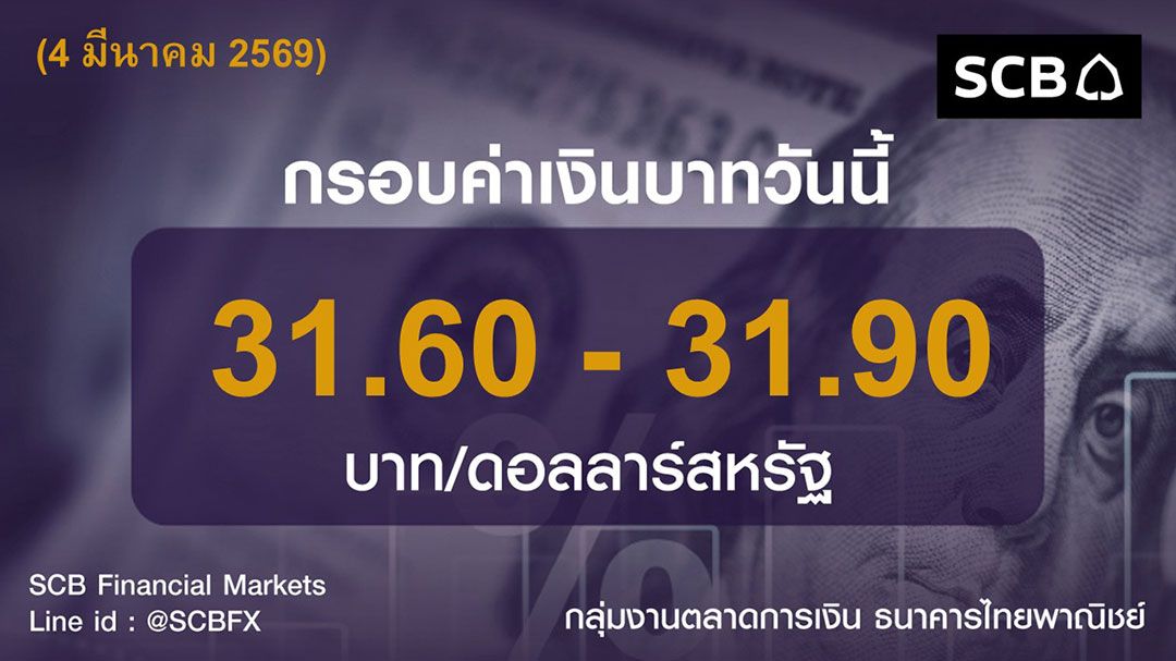 • กลุ่มงานตลาดการเงิน ธนาคารไทยพาณิชย์ (SCB Financial Markets)ประเมินค่าเงินบาทวันนี้เคลื่อนไหวในกรอบ 31.60-31.90 บาท/ดอลลาร์