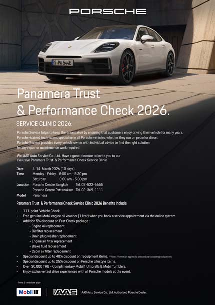 เอเอเอส ออโต้ เซอร์วิส ตัวแทนจำหน่ายรถยนต์ปอร์เช่อย่างเป็นทางการแห่งแรกในประเทศไทย ด้วยมาตรฐานศูนย์บริการระดับโลกจากโรงงานปอร์เช่ ประเทศเยอรมนี ผสานความเชี่ยวชาญของทีมช่างผู้ผ่านการรับรอง ขอเชิญเจ้าของรถยนต์ปอร์เช่รุ่นปอร์เช่ พานาเมร่า (Panamera) เข้าร่วมแคมเปญสุดพิเศษ “Porsche Service Clinic Panamera Trust & Performance Check 2026 ระหว่างวันที่ 4 – 14 มีนาคม 2569 ณ Porsche Centre Bangkok และ Porsche Centre Pattanakarn